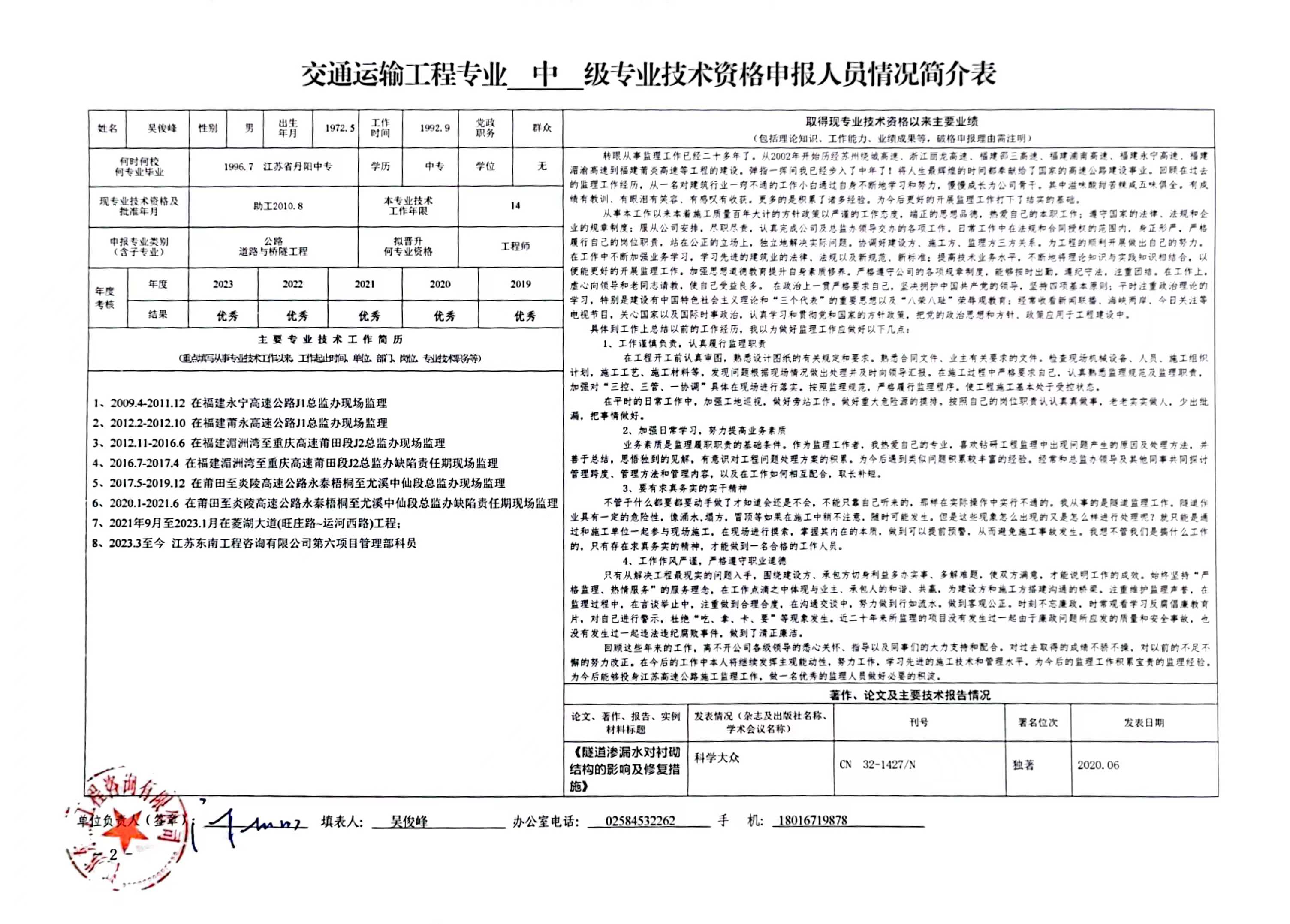 根據(jù)《江蘇省交通運輸工程專業(yè)技術(shù)資格條件(試行)》規(guī)定,2024年度有吳俊峰同志擬申報江蘇省交通運輸廳交通運輸工程公路(道路與橋隧工程)專業(yè)中級工程師。為體現(xiàn)公開、公平、公正原則,廣泛聽取群眾意見,現(xiàn)將擬申報人員信息予以公示。
